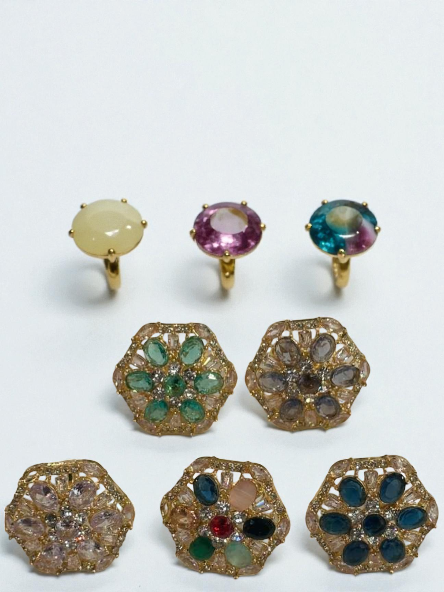 These dazzling Gold Plated Rings are perfect statement accessories, offering luxurious sparkle and vibrant color. Each ring features a bold, hexagonal floral cluster design, with a central arrangement of stunning colored stones surrounded by brilliant clear and accent AD (American Diamond) stones.