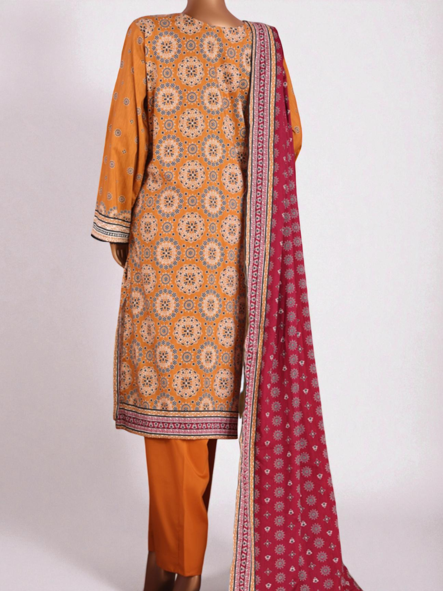 The suit includes plain Mustard Trousers that perfectly match the base color of the shirt, and a beautiful, contrasting Printed Dupatta in a deep Maroon/Berry color. The dupatta features a dense print with a wide, patterned border mirroring the shirt’s design, adding depth and visual interest to the complete look.
