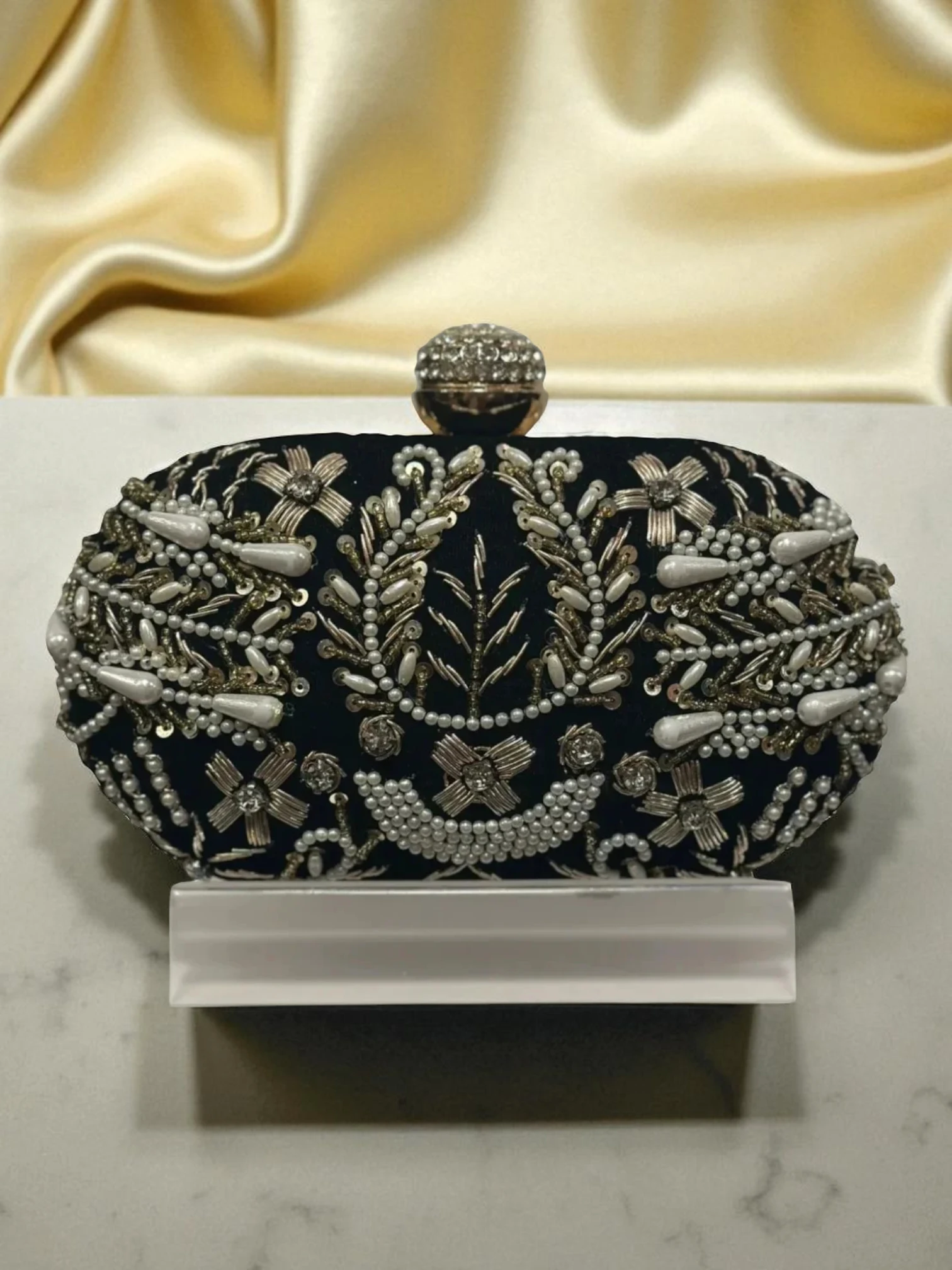 Make an unforgettable, high-fashion entrance with this opulent Black Velvet and Gold Filigree Clutch. The clutch is a hard-shell box structure crafted from luxurious black velvet, providing a rich, deep contrast that makes the embellishment pop.