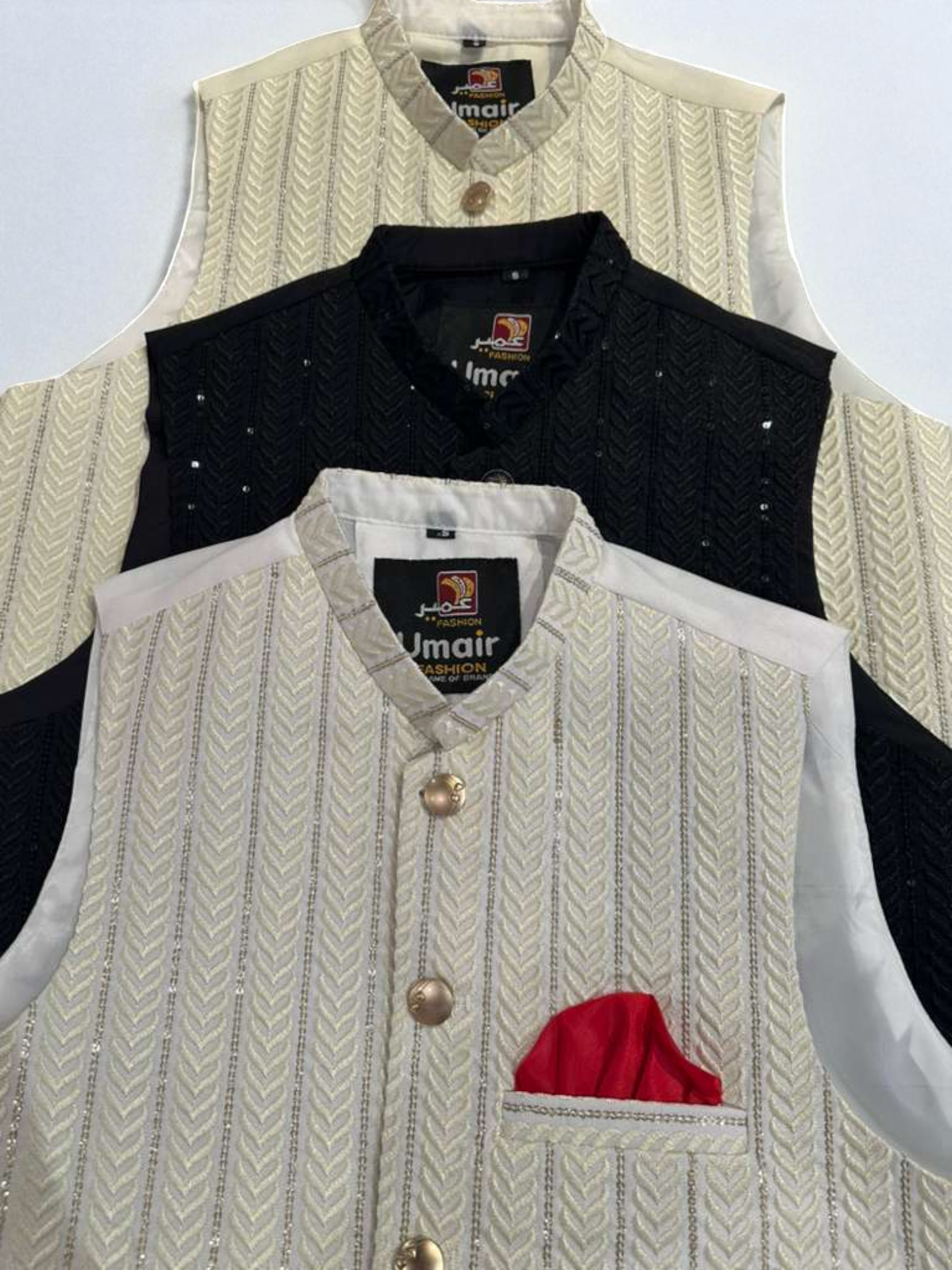 The vest is designed with a classic mandarin/band collar and is available in three versatile colors: White, Off-White, and Black. This piece is perfect for wedding festivities, formal events, religious ceremonies, or as a sophisticated layering piece for an upscale look.