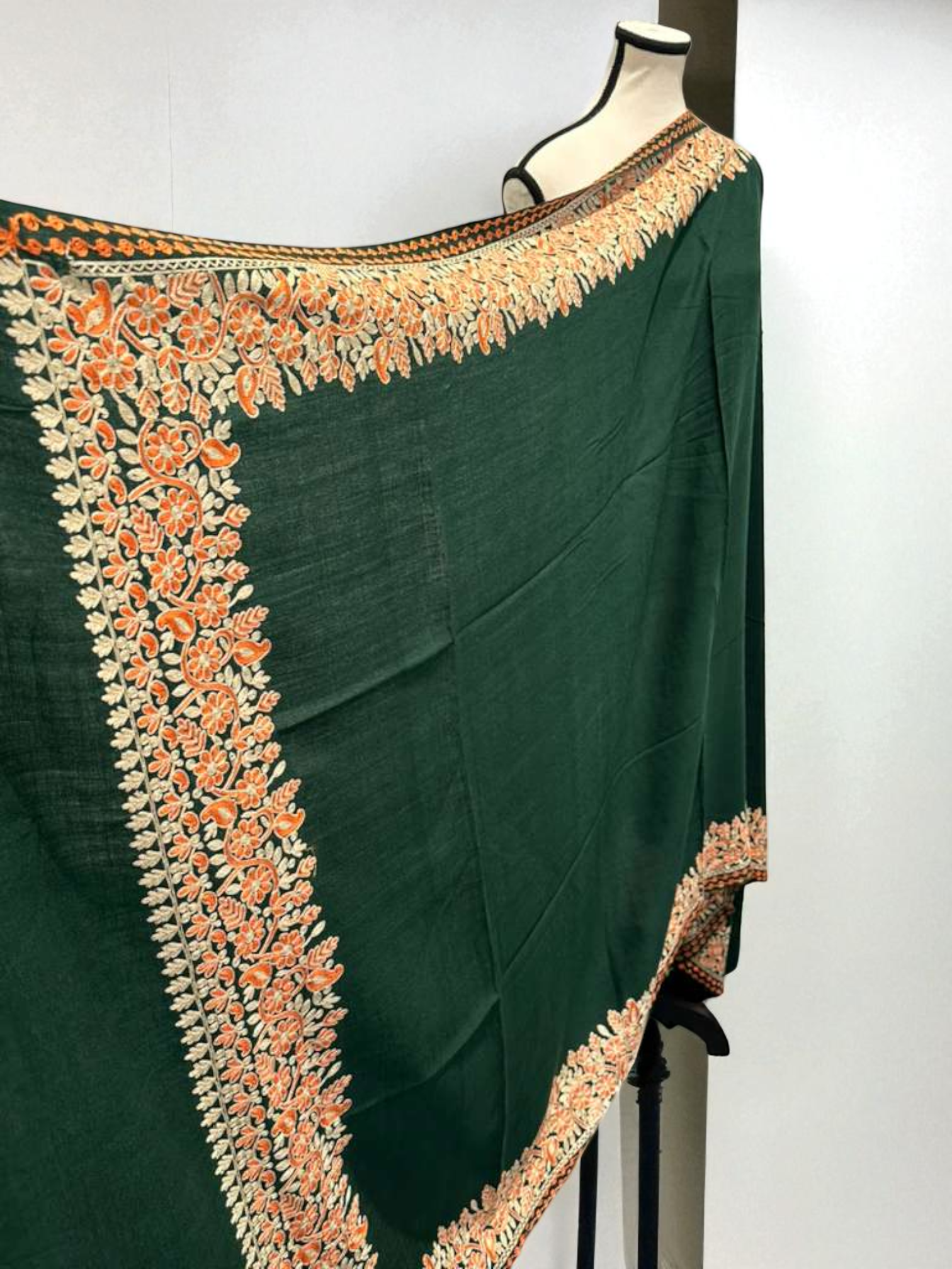 The shawl features a rich Emerald Green color that offers a beautiful backdrop for the intricate craftsmanship. Both ends of the shawl are heavily detailed with traditional Kashmiri embroidery in a warm palette of Orange and Beige threads. This elegant border work provides a striking contrast and traditional appeal. At a generous length of 91 inches and a width of 45 inches, this is a full-size shawl perfect for draping elegantly over formal or wedding attire.