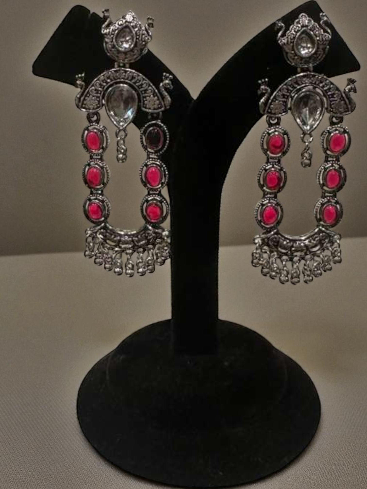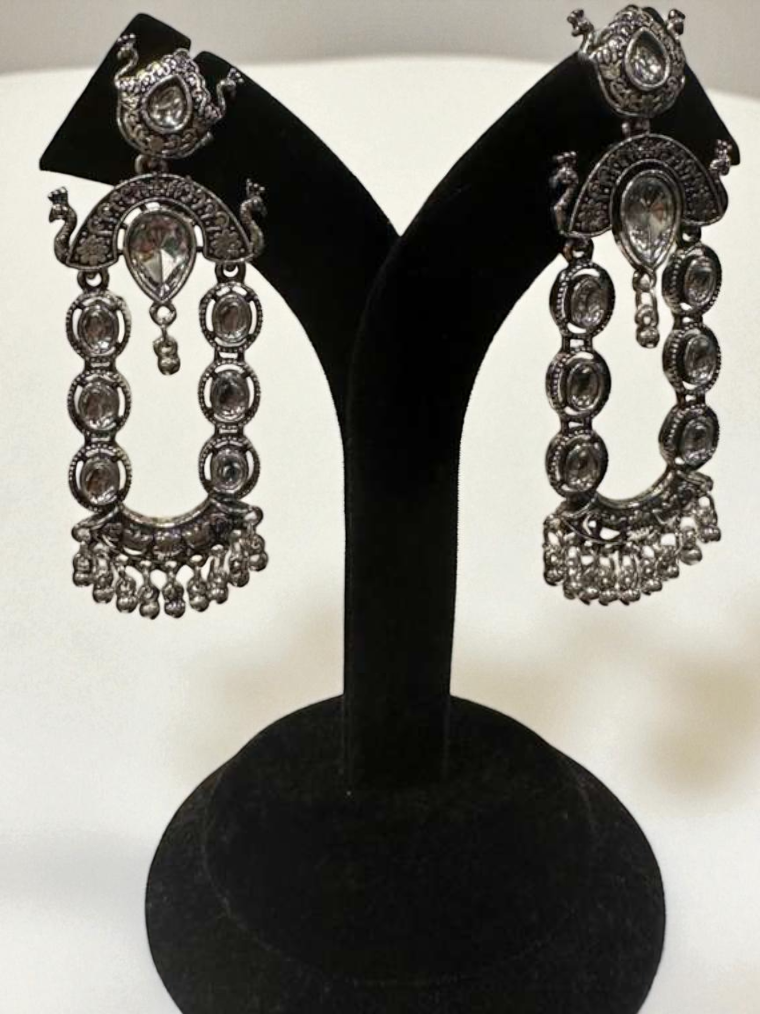 Bold German Silver Drop Earrings with an oxidized finish and traditional Peacock Motif. Features large central stones and a fringe of metallic bead drops.