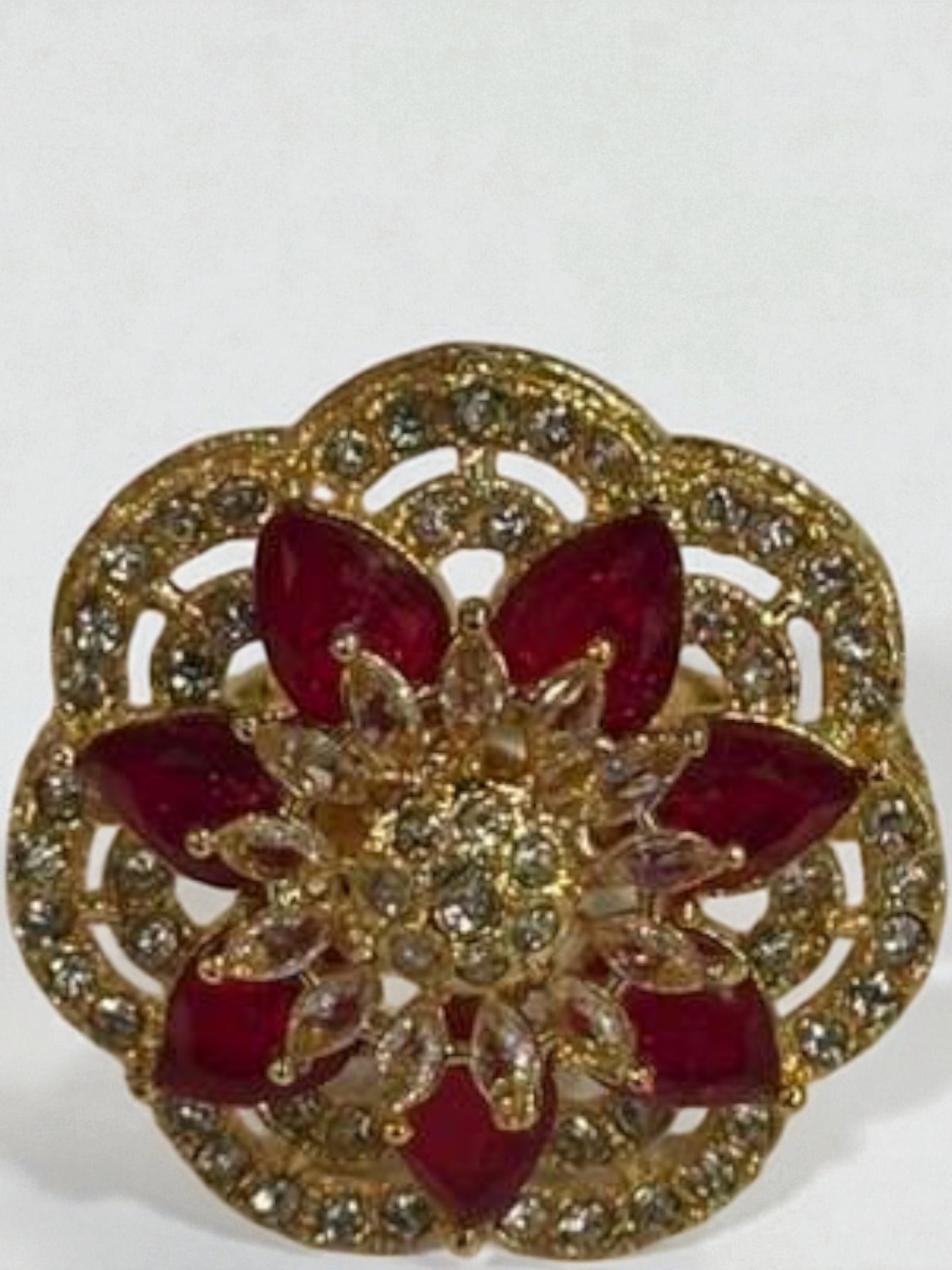 Sparkling Gold Plated Floral Rings with AD stone accents. Adjustable and available in multiple vibrant colors including Red, Pink, and Green.