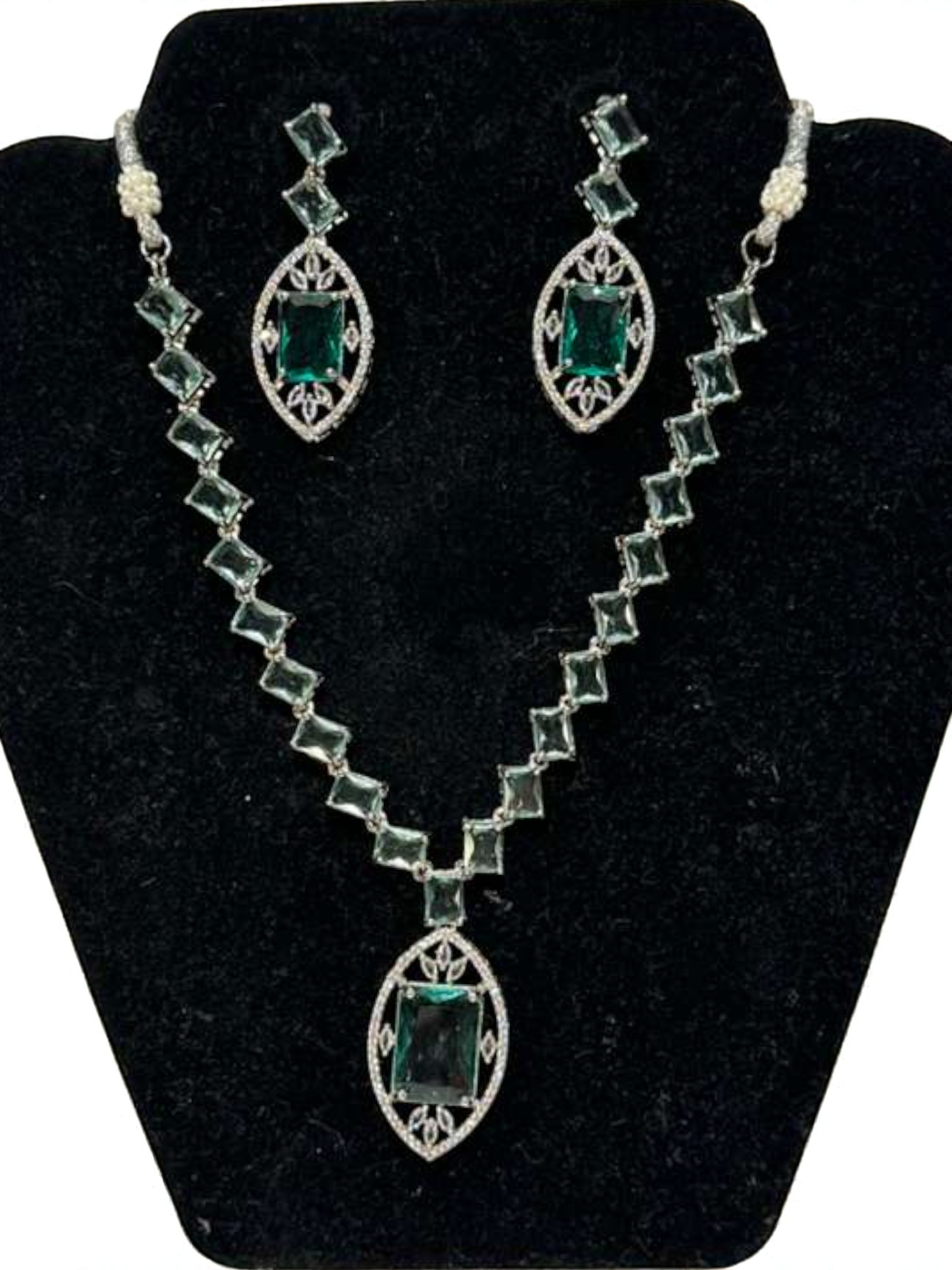 This sophisticated American Diamond (AD) Stone Set offers a contemporary take on classic elegance. The set includes a distinctive necklace and matching drop earrings, all finished in a brilliant Silver Polish. The central feature is the gorgeous Ice Blue color (a light, cool-toned teal or aqua) of the stones, which are mainly cut in a geometric, elongated emerald-cut or baguette style.