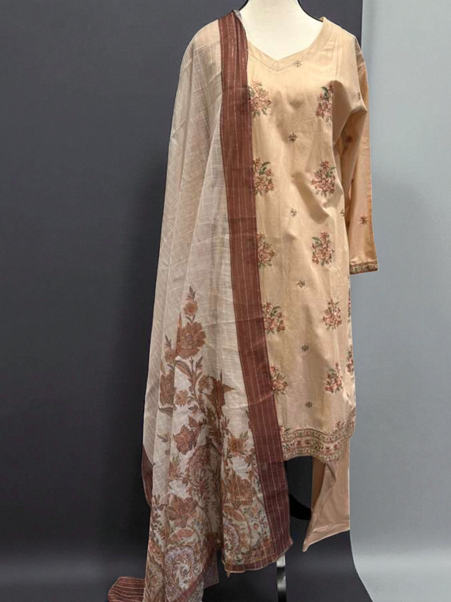 Elegant Light Brown Cotton 3PC Suit featuring scattered floral embroidery and a richly patterned Doria Printed Dupatta.