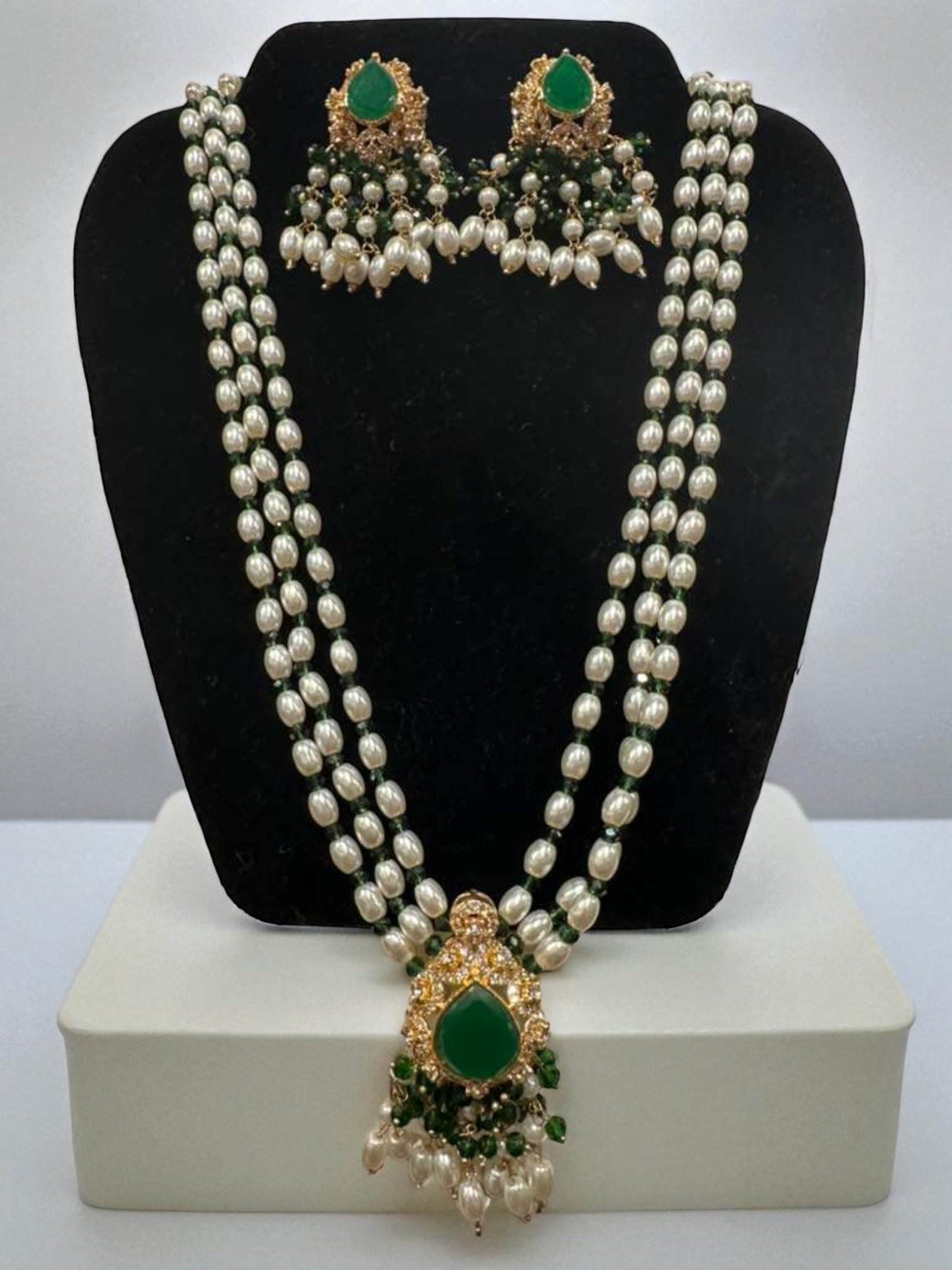The focal point is an intricate, Gold Plated pendant accented with a prominent teardrop-shaped center stone. The pendant is finished with a delicate tassel of pearl drops and small green beads hanging from the bottom, enhancing its festive appeal. The set includes beautifully coordinating matching earrings that mirror the pendant’s design, complete with their own pearl drops and subtle color accents.