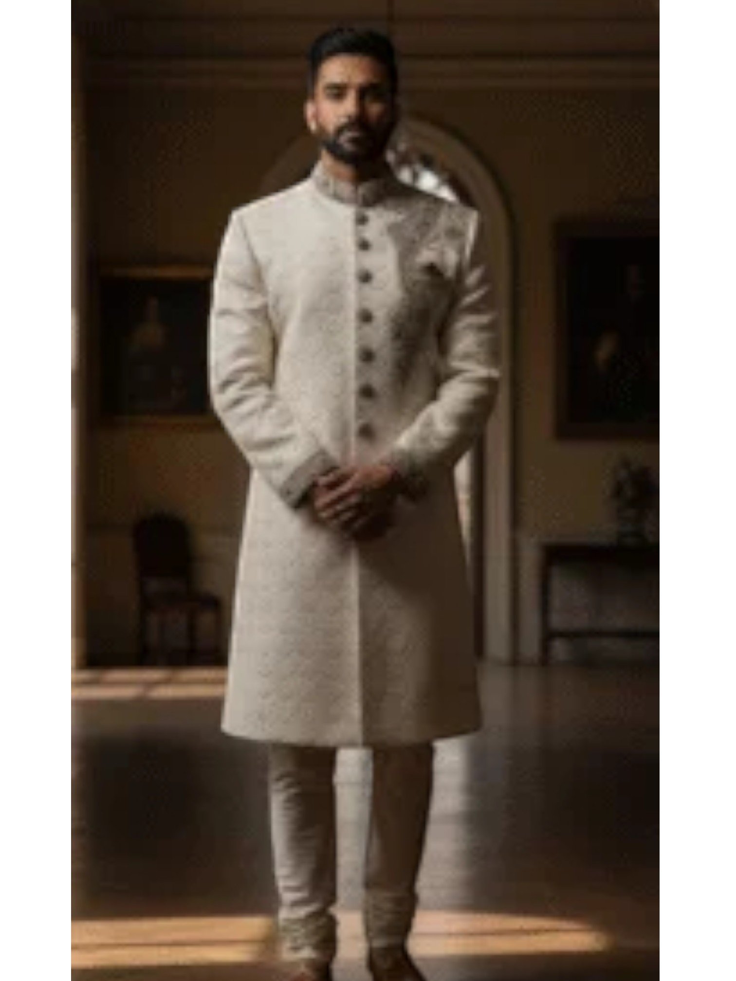 Presenting an exquisite Off-White Zari Embroidered Sherwani, a perfect choice for grooms and grand celebrations. This single-piece sherwani is crafted from a rich zari-embroidered fabric, providing a subtle shimmer and elegant texture throughout.