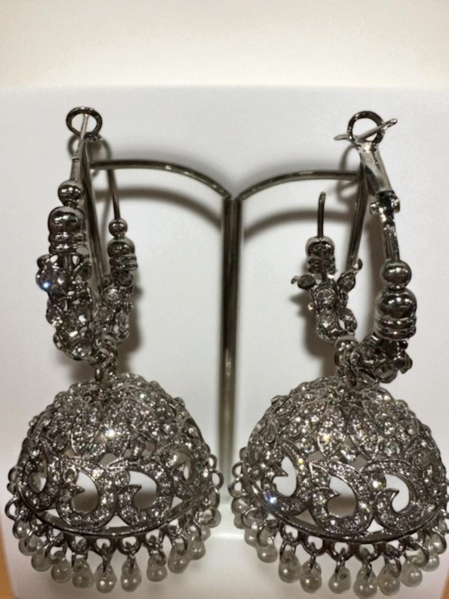 Dazzling Silver Bali Jhumka Earrings heavily encrusted with rhinestones and finished with pearl drops. Traditional hoop-style closure