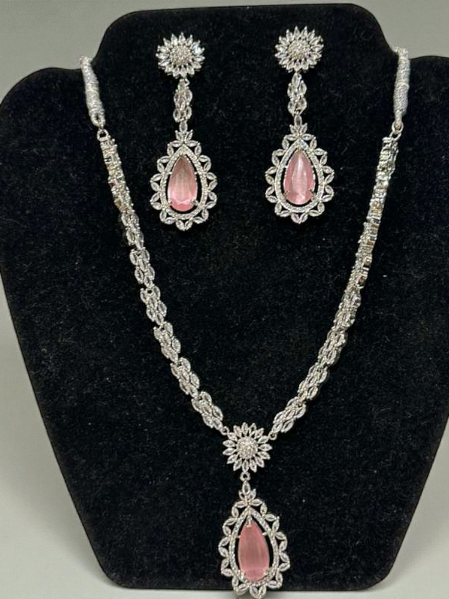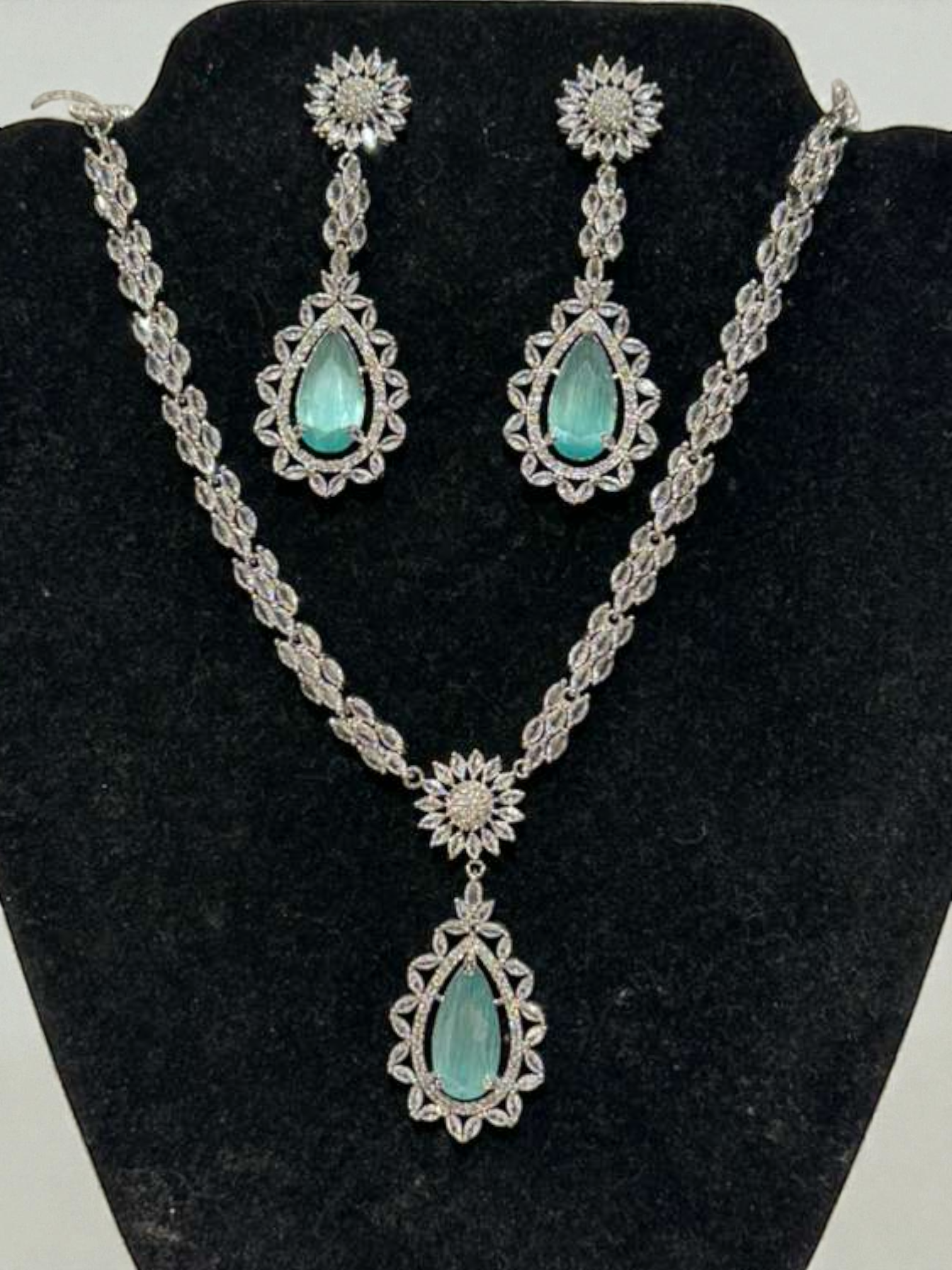 Dazzling AD stone necklace and earring set in a bright Silver Polish. Features a spectacular teardrop drop, available in Mint, Pink, or Clear central stones.