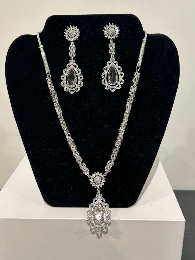 Design Delicate, linked AD stone chain leading to a prominent teardrop pendant. Floral-inspired earring post and pendant bail.